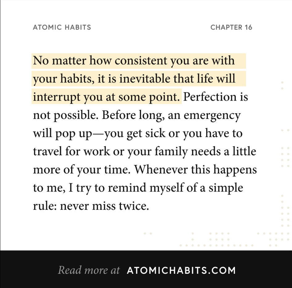 “I’ve seen variations of the ‘never miss twice’ concept seemingly everywhere. Trying to build win streaks — in my case, going to the gym, even when I don’t feel like it — can be tough; but if you avoid building losing streaks, the improvement will stack up.”