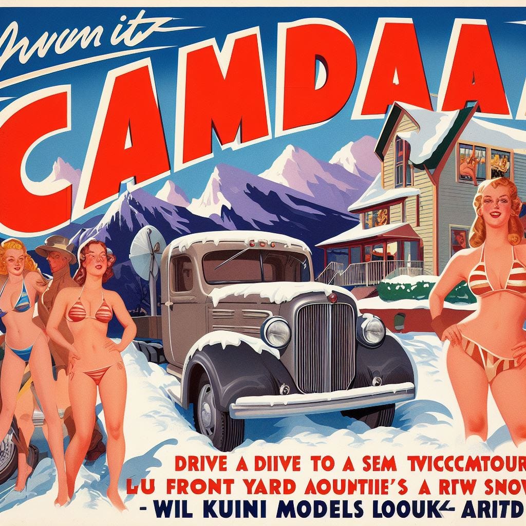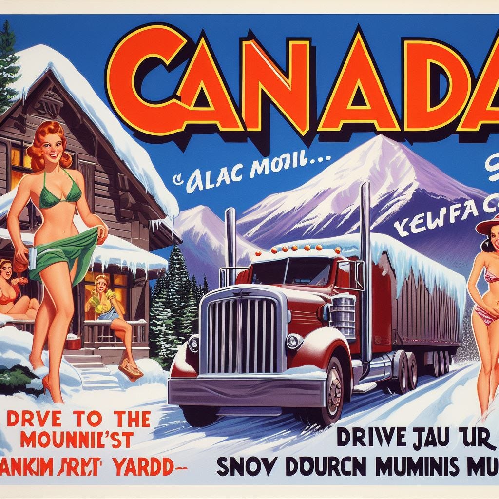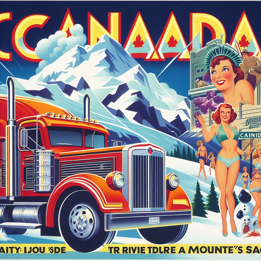 In continuing with our travel poster theme, I created a rather random prompt: “Create a vintage travel poster inviting people to visit Canada by driving a semitruck onto a Mountie’s front yard while bikini models look on.”