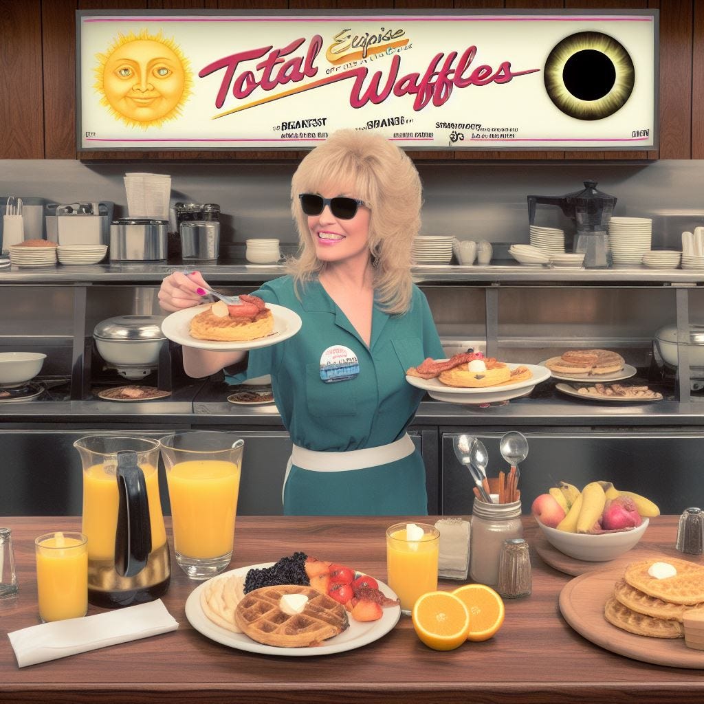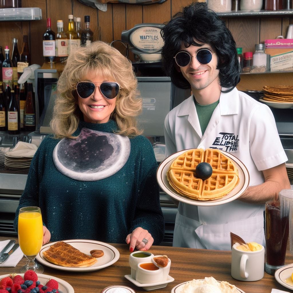 Turn around. Every now and then I ask “Create an image of Bonnie Tyler serving breakfast in a diner called ‘Total Eclipse of the Waffles.’”