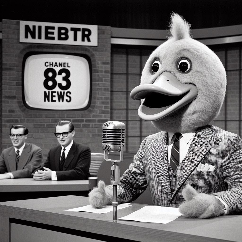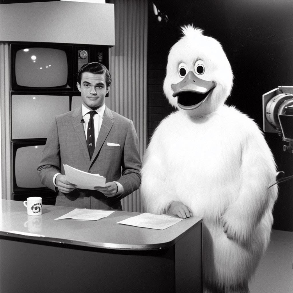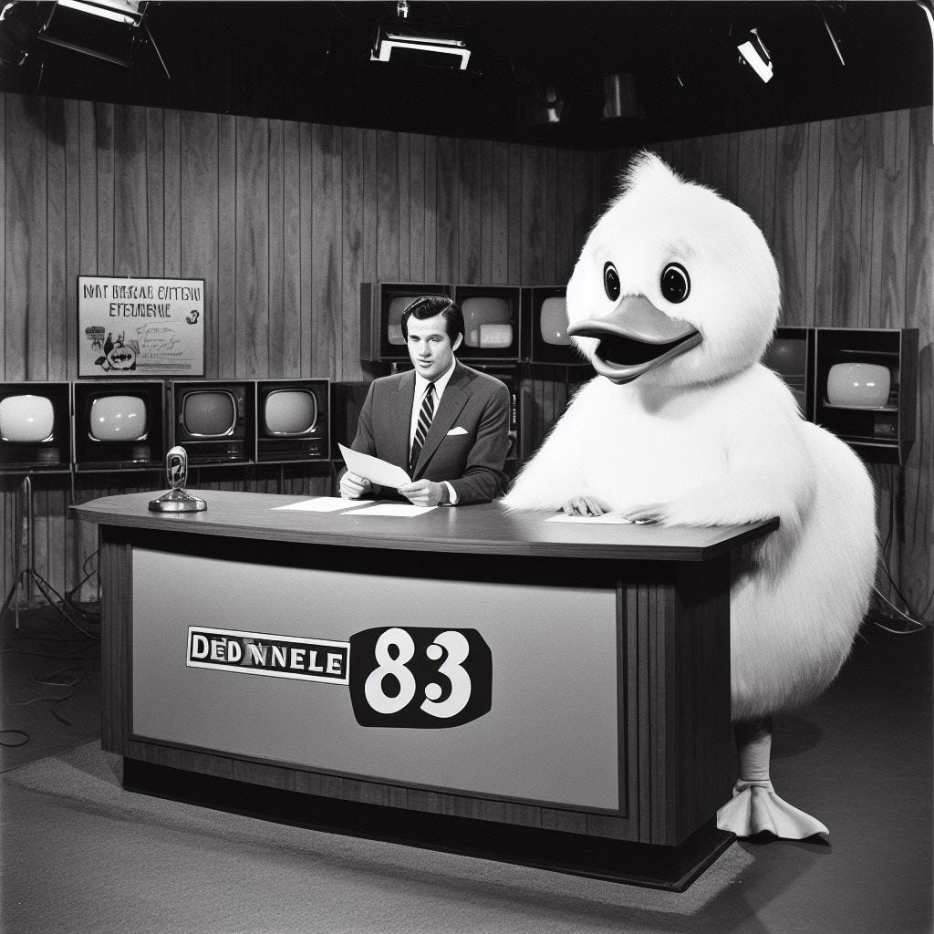 “Create a photo of a 1960s era news team for Channel 83 with one of the anchors being a man in a duck costume.”
