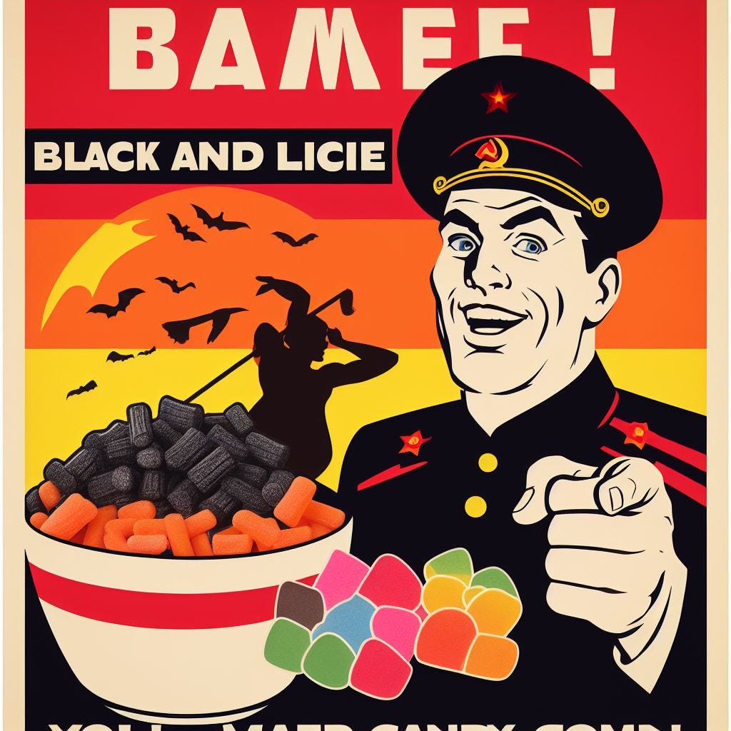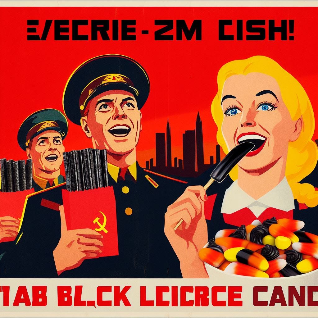 Prompt: “Create a Soviet propaganda poster that invites readers to eat black licorice and candy corn.”