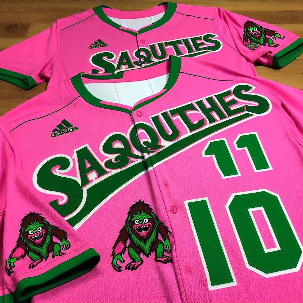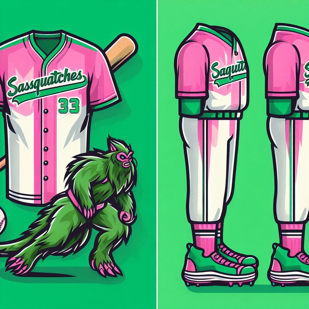 “Create a uniform for a baseball team called the ‘Sasquatches’ using the colors pink and green.”