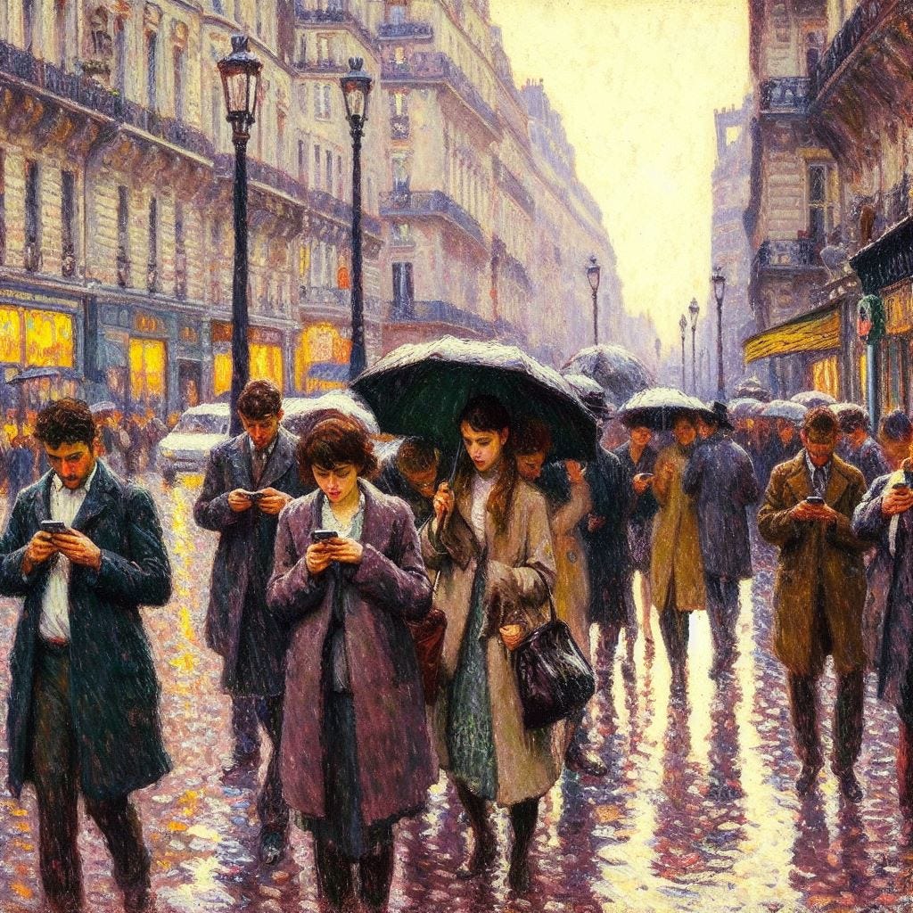 As my prompts started to get better, I started asking more direct questions of the machine. Such as “Create a painting in the style of Gustav Caillebotte’s ‘Paris Street, Rainy Day,’ but with everyone looking at their mobile phones.”
