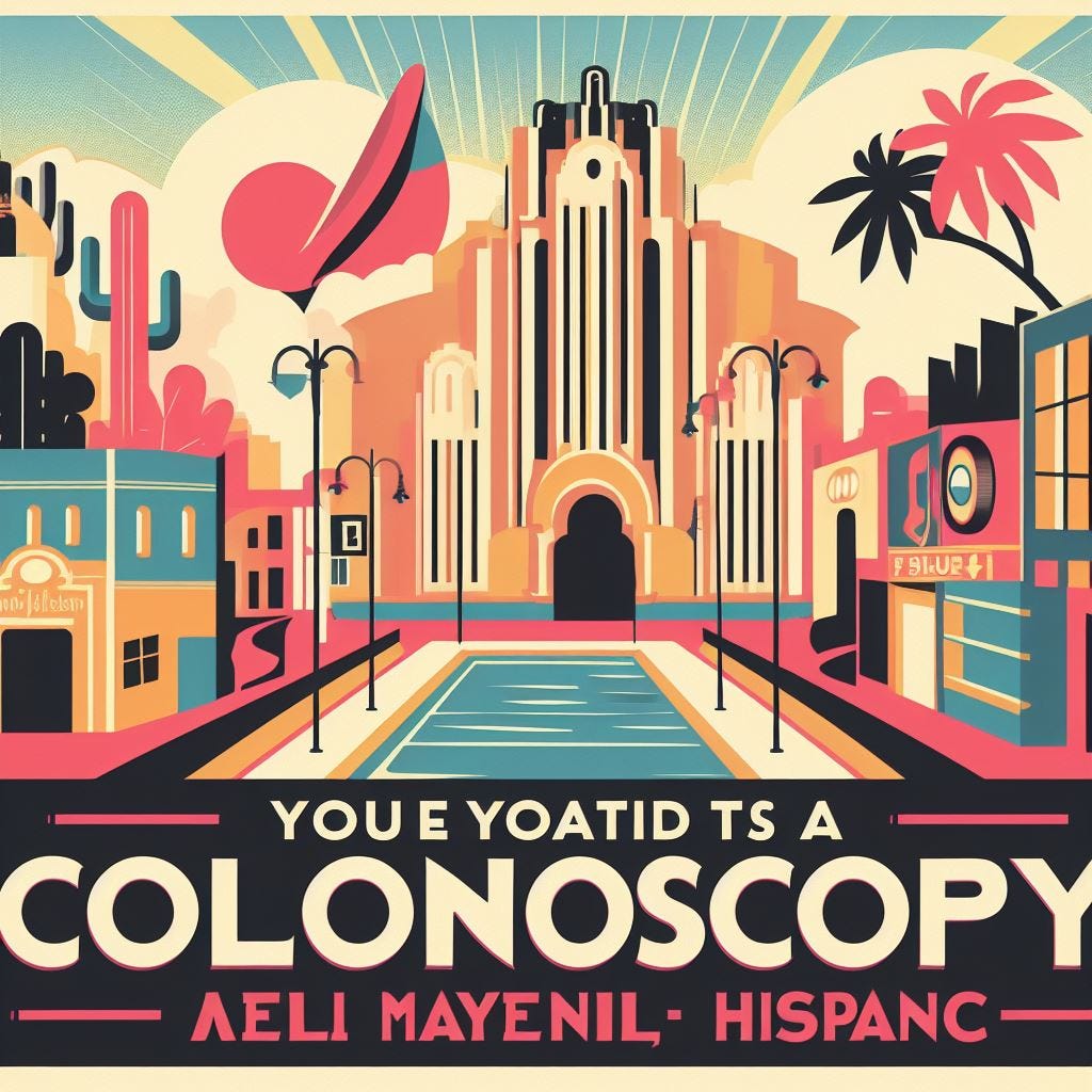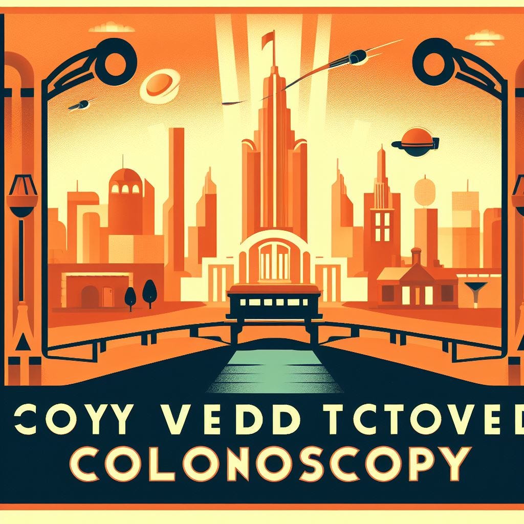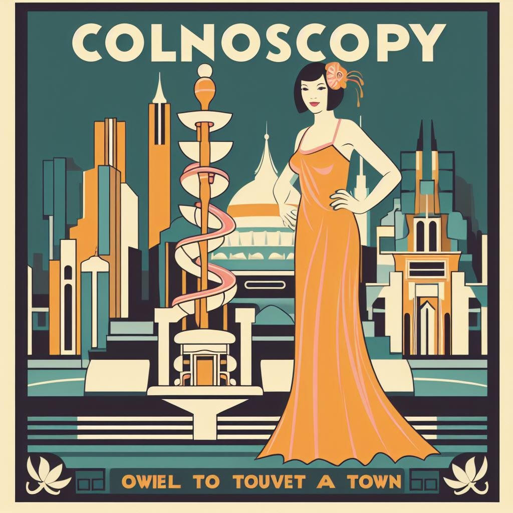 Prompt: “Create an art deco-style travel poster inviting people to visit a place called ‘Colonoscopy.’”